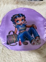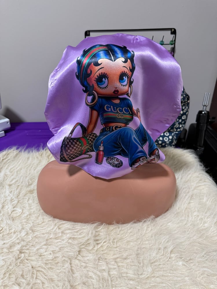 lavender satin drawstring, bougie GG Betty hair bonnet.