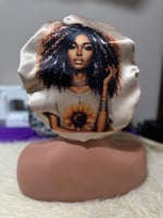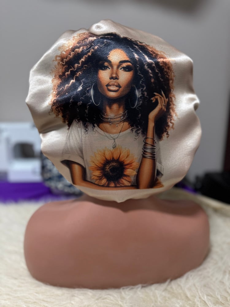 Afrocentric woman on champagne-colored satin. Reversible to an African material. The hair bonnet is designed to withhold heavy oils.